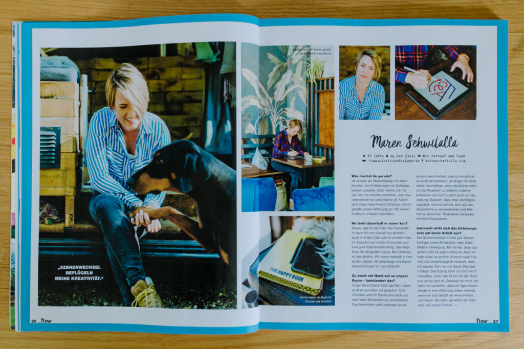 Ich platze vor Stolz und feiere mich selbst und freue mich einfach riesig. Für mich selbst, aber auch für Maren, die in diesem Zusammenhang ihre Geschichte erzählen durfte. Die ohnehin gerade extrem spannend ist, denn sie und ihr Partner Christian haben ihren festen Wohnsitz aufgegeben und ziehen jetzt in ihrem umgebauten Van durch die Lande. Dazu hat sie im kurzen Interview in der Flow auch ein bisschen erzählt!